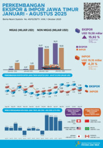 Sedangkan neraca perdagangan Jawa Timur selama bulan Januari – Agustus 2025 mengalami surplus yaitu mencapai 420,89 juta dolar AS.